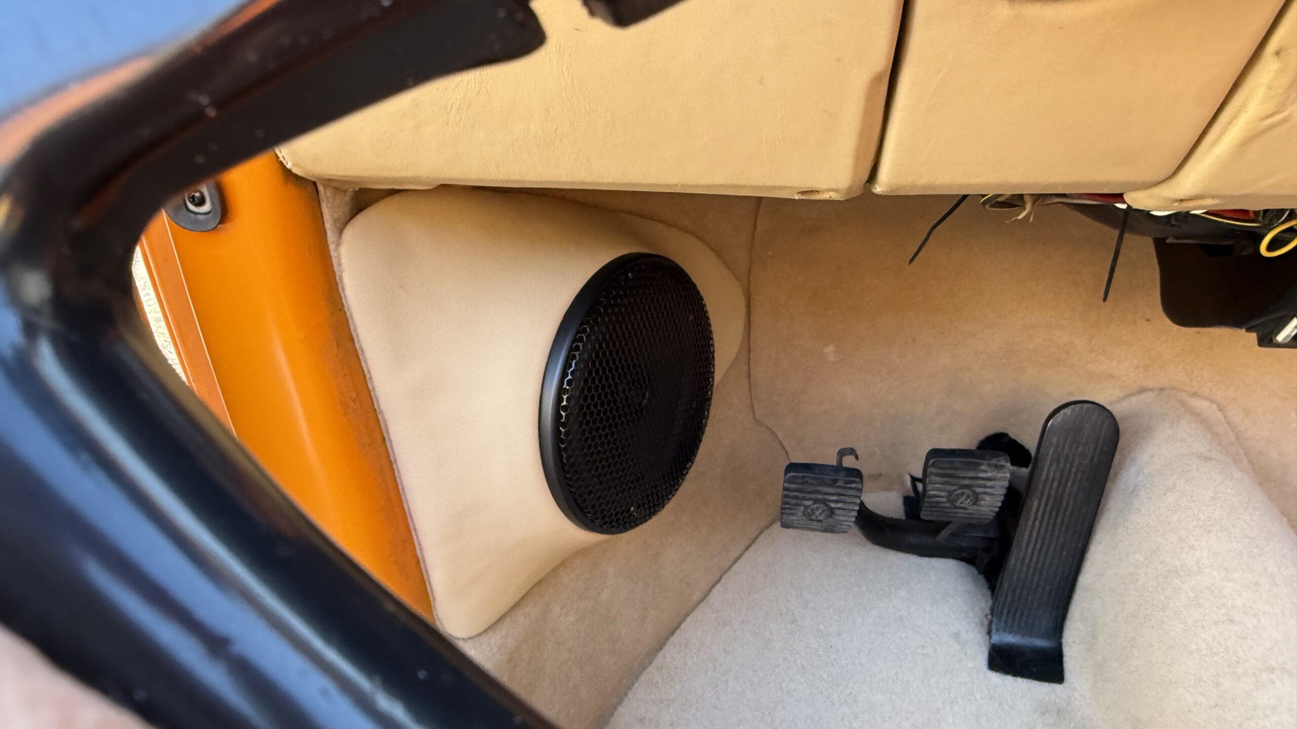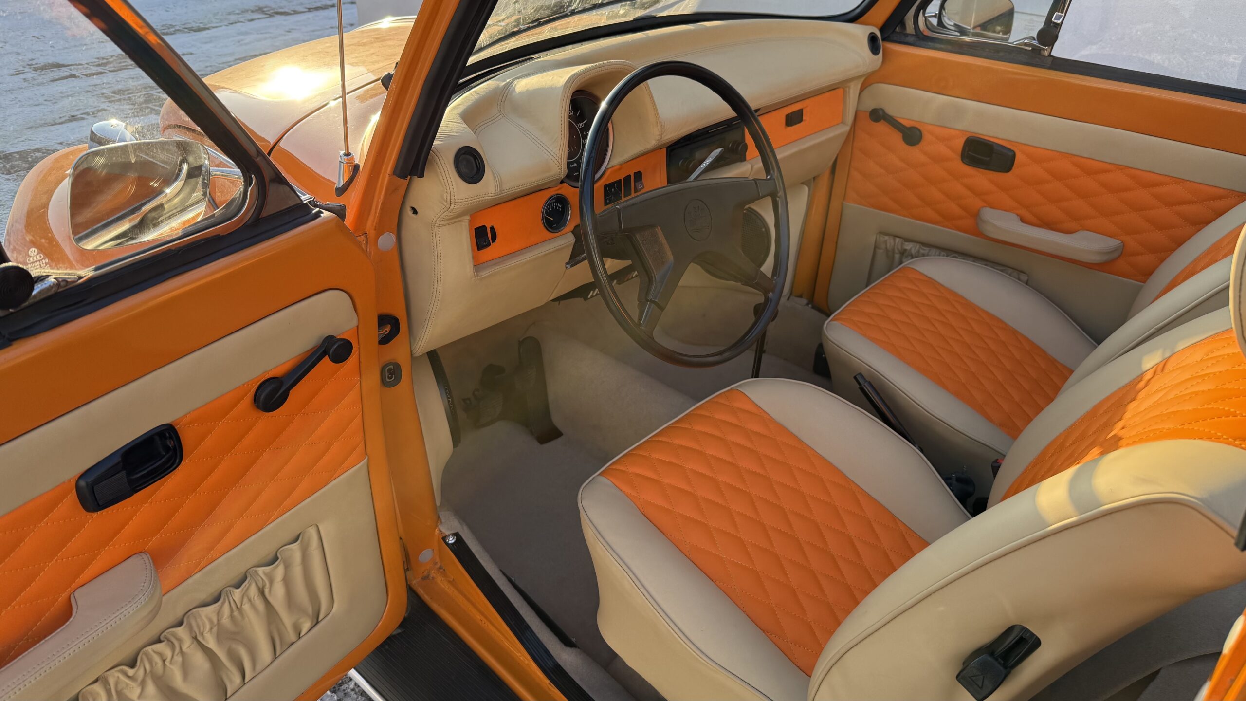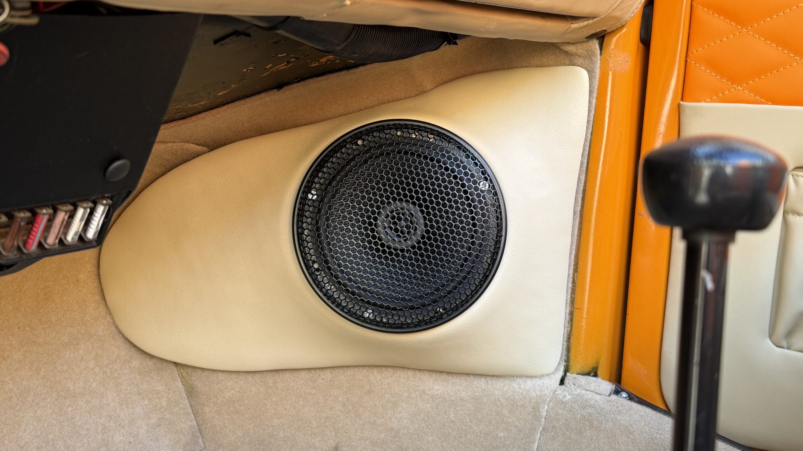 VW Käfer mit RetroSound Radio und Helix Lautsprechern ausgestattet. Das Radio hat DAB+, Bluetooth Freisprechanlage, Bluetooth Streaming und USB und die Lautsprecher bekamen, aus GFK, angefertigte Kickpanele die mit Leder bezogen wurden