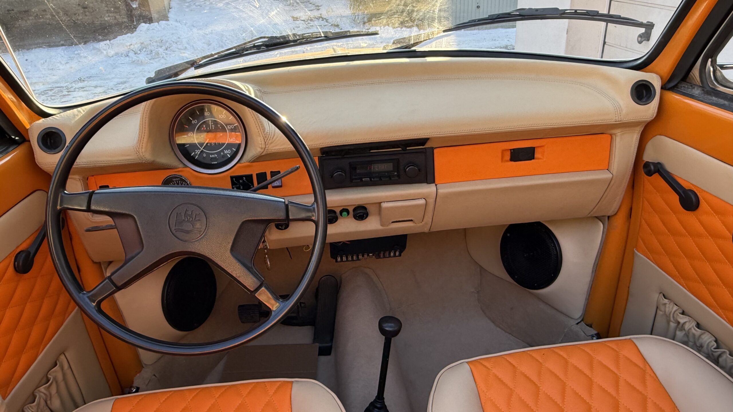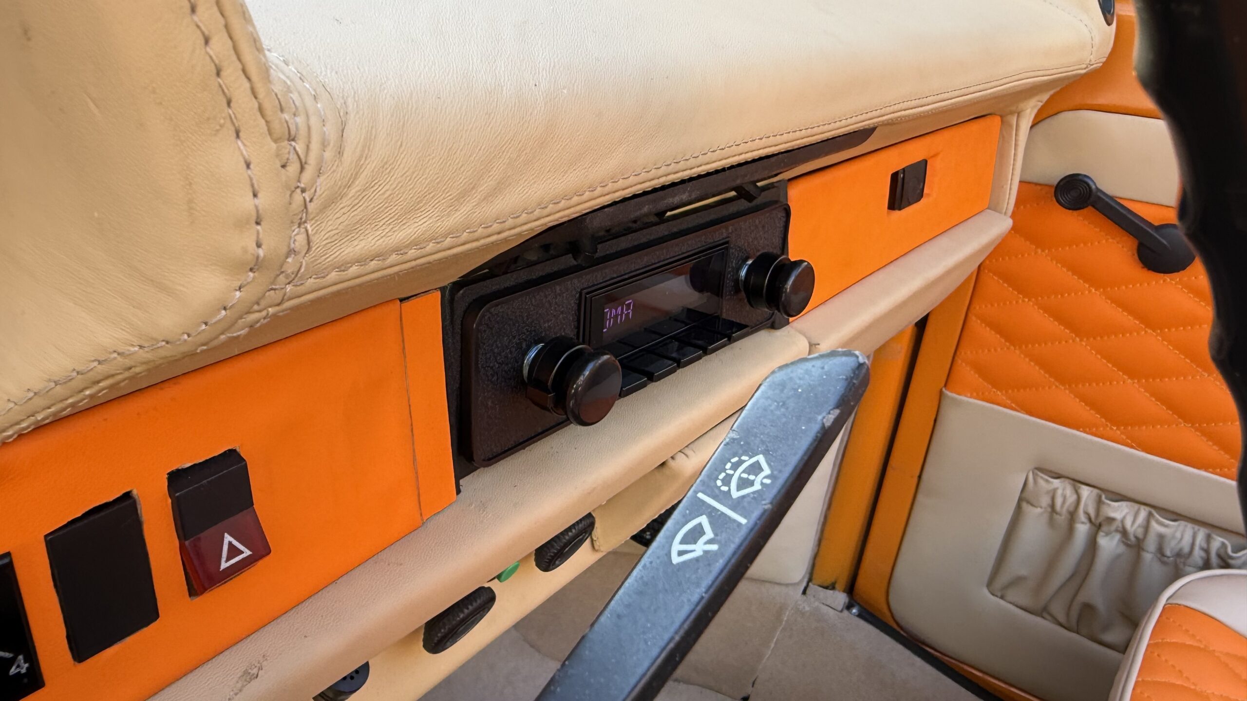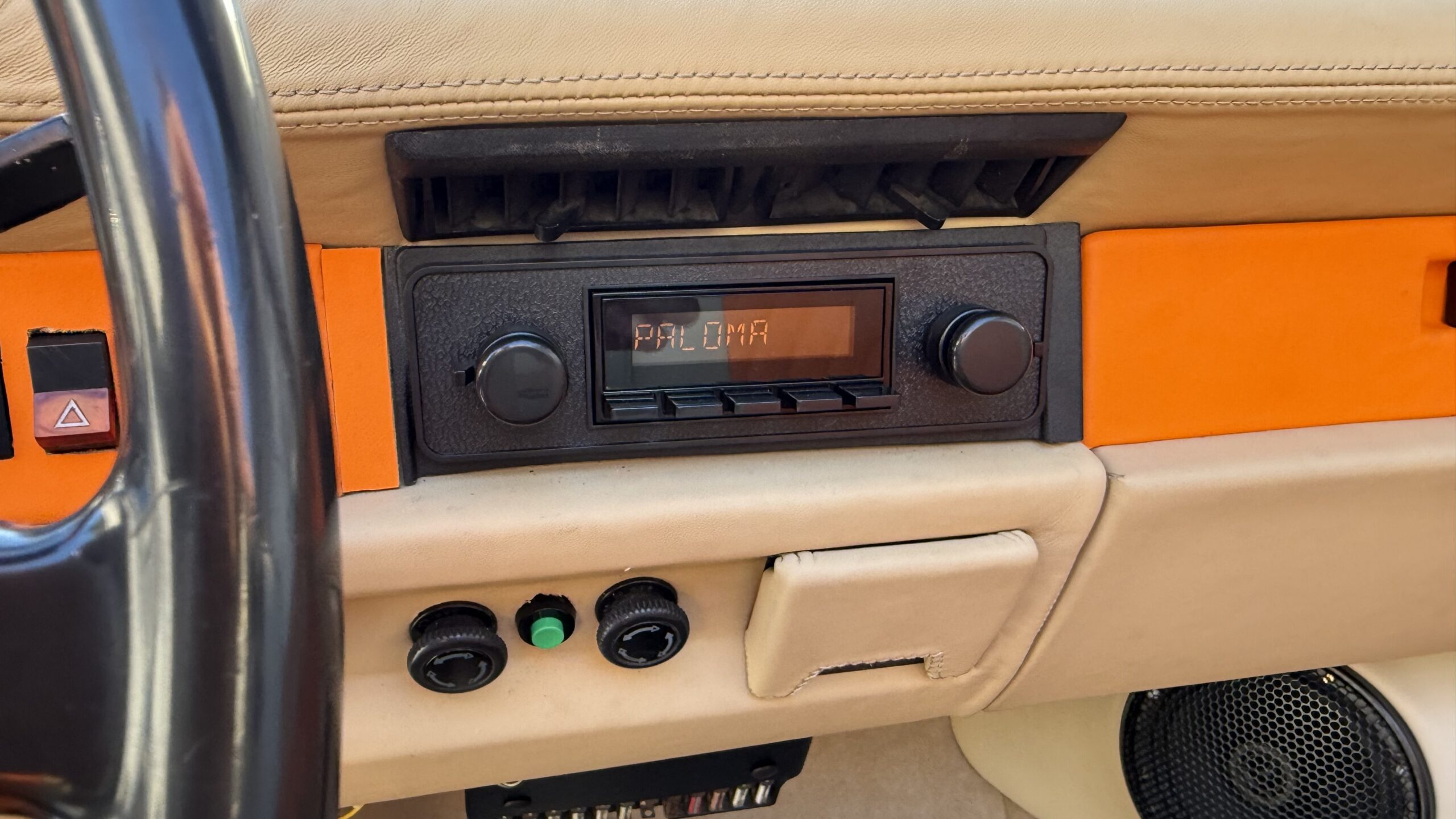 VW Käfer mit RetroSound Radio und Helix Lautsprechern ausgestattet. Das Radio hat DAB+, Bluetooth Freisprechanlage, Bluetooth Streaming und USB und die Lautsprecher bekamen, aus GFK, angefertigte Kickpanele die mit Leder bezogen wurden